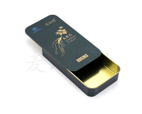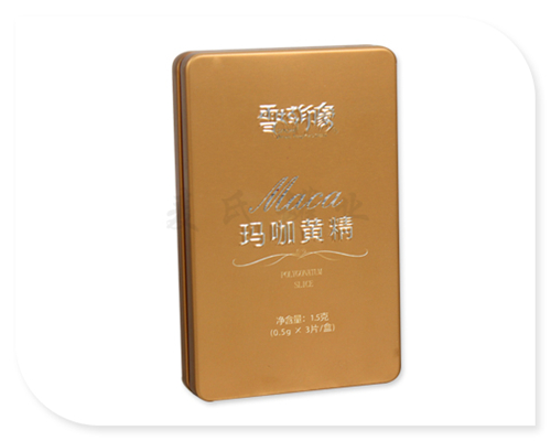 該款冬蟲夏草含片馬口鐵包裝盒選用四片式內塞蓋結構,長方形結構,表面光滑平整,不易劃手。鐵盒做工精細,盒蓋與盒身配合良好便于打開,骨位平滑。而這款鐵盒具有耐蝕性、防潮性等優點,印刷工藝更為一絕!
