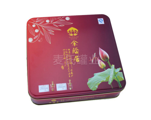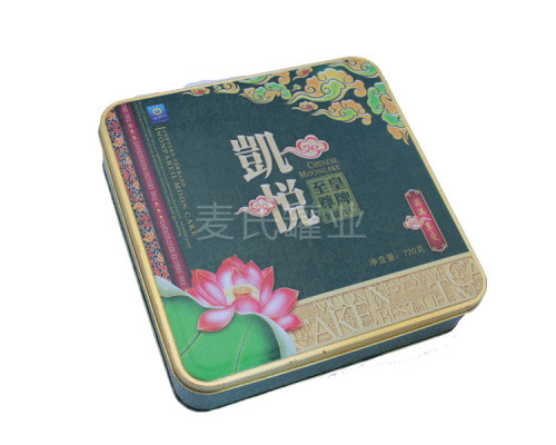此款大號月餅鐵盒子,結構為三片式天地蓋結構,內卷線鑼底。印刷為單面四色+1專色處理,罐、身、底均有印刷,外過啞油,內過符合國標的食品級金油設計。其材質為國產0.23mm馬口鐵制成,具有優異的馬口鐵料,具有優異的密封性,防潮性能特點,適合您的月餅產品不易受潮變質,可適應長期運輸流通的包裝要求。